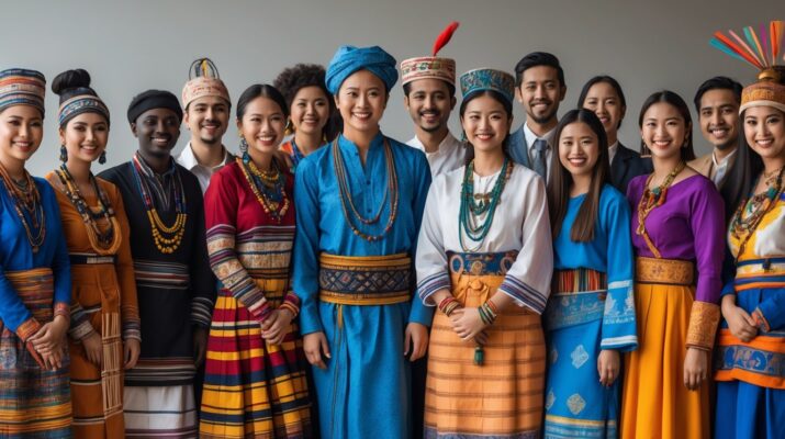 Sekelompok orang dari berbagai suku terbesar di dunia mengenakan pakaian tradisional khas mereka berdiri bersama dengan latar belakang netral.