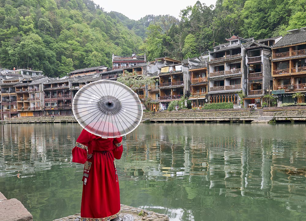Chinese travelers rent traditional tribe clothes wearing costume for take photo in tuojiang river and Historic Xiangxi Phoenix Ancient City or Antique Fenghuang Old Town in Hunan, China