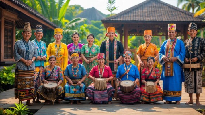 Sekelompok orang Indonesia mengenakan pakaian adat dari berbagai suku sedang melakukan aktivitas budaya di luar ruangan dengan latar alam dan bangunan tradisional.