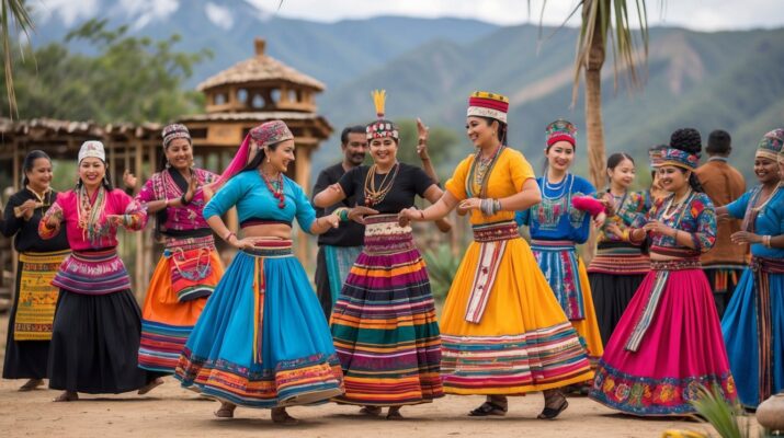 Sekelompok orang dari berbagai suku bangsa dunia mengenakan pakaian tradisional mereka sedang berinteraksi dengan latar belakang alam.